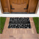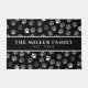 Doormat con temática animal que presenta un diseño elegante y caprichoso patrón de impresión de la pata de perro perrito con huellas de pata gris y blanco sobre un fondo negro. El nombre de la familia personalizado y el año establecido se presentan en una pancarta negra con acentos y textos en gris y blanco. Personalice con el nombre de la familia personalizado y el mensaje de bienvenida de personalizado o fecha establecida por el año de su elección, o utilice el botón "diseñador de mensajes" para obtener ayuda. Una puerta personalizada para su entrada para dar la bienvenida a sus huéspedes, o una casa moderna para los amantes de las mascotas en su vida o para cualquier ocasión.