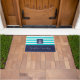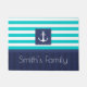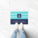 Estera de puerta náutica con el texto de la turquesa y del modelo rayado y del personalizable de los azules marinos.
