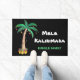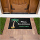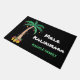Mele Kalikimaka Festive Holiday/Navidades Door Mat. Esta divertida alfombra de puertas está decorada con una palmera acuarela, luces de Navidad y piñas. El texto es personalizable. Personalice esta alfombra con su nombre. Acuarela original © Michele Davies.