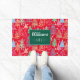 Esta alfombra de puertas de vacaciones, linda y alegre, presenta un patrón de árboles de Navidad extravagantes en rojo, verde, rosa y azul sobre un fondo rojo ilustrado por el mundialmente reconocido artista Tim Coffey. En el centro de una plaza verde está tu apellido para personalizar. Hace un regalo único para las vacaciones.