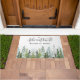 Añade un toque de estilo a cualquier hogar con este felpudo de súper moda. Este doormat presenta un bosque de pino acuático pintado a mano con el lema de moda "la aventura empieza en casa".