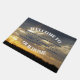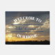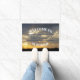 Invite a los huéspedes a su casa con este felpudo con mi fotografía original, "Sunset Through The Clouds" (Atardecer a través de las nubes). A lo lejos, la foto muestra una silueta de los árboles. En la parte superior hay unas nubes suaves y grises, con aberturas que permiten que el sol se eleve. Debajo de las nubes grises hay un cielo amarillo dorado. El texto en negrita y blanco en arco dice "BIENVENIDOS A NUESTRA CASA". El texto guionado, en el centro puede ser personal con tu nombre. (Ejemplo: The Smiths; Sr. y la Sra. Smith; John y Mary Smith)