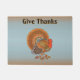 This outdoor welcome door mat is light blue with orange top and bottom borders and and an Autumn coloured male turkey with fanned tail standing in Fall leaves. Customise your text with the template.