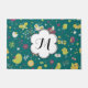 Aves caprichosas y mariposas con un diseño hermoso, colorido, artístico y caprichoso de aves, mariposas, flores, corazones y x's. El diseño de este bonito incluye aves y mariposas de vino, verde y dorado con un fondo verde azulado. Esta divertida y colorida alfombra de puerta presenta un banner con forma de flor blanca que puedes personalizar fácilmente con tu primer monograma.