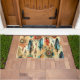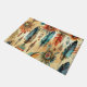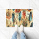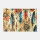 Azteca boho nativa acuarela de Estados Unidos diseño tribal de plumas azul turquesa, girasoles rojos abstractos y formas geométricas sobre un fondo de arena desértica.