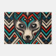 Se trata de una cara decorativa de lobo hecha a mano y estilizada con estampados aztecos en colores negro, rojo, turquesa y beige.