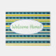 Bandas y triángulos azules y amarillos, Bienvenida, texto personalizado.