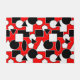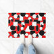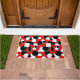 Este doormat tiene un diseño Bauhaus de triángulos, círculos, rectángulos y pentagones en blanco y negro sobre un campo de rojo.