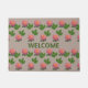 Hermosas rosas rosas en la alfombra de puerta beige. El texto de bienvenida se puede personalizar.