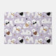 El bichón cutáneo frita perros en sudaderas y arcos con huesos de perro dispersos y huellas de pata sobre un fondo morado claro.