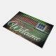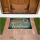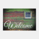 Este felpudo tiene una ventana retratada y dice "Bienvenidos".