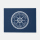 Estera de puertas con emblema blanco y elegante de la rueda y cuerda del barco con texto personalizado "bienvenido a bordo" y nombre del barco con un fondo azul oscuro.