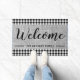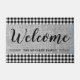 Casa de campo rústica Bienvenidos a Doormat personalizado con nombre familiar.El diseño de chapa y burlap negro y blanco gingham le da un aspecto rústico a su decoración de entrada.