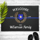Gran insignia policial y delgada línea azul para esta divertida alfombra de bienvenida.