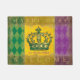Esta alfombra presenta una corona de color verde y dorado sobre un patrón verde, amarillo y violeta de diamantes de arlequín. El texto "Mardi Gras" junto con un ejemplo de apellido y la palabra "Bienvenidos" para que usted lo personalize con sus propios detalles.