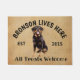 Rottweiler Personalized Dog lover bienvenido doormat. Esta alfombra de bienvenida se puede personalizar con el nombre de su perro, el lema también se puede cambiar o se puede usar una imagen de su propio perro (asegúrese de que es transparente). El texto dice: Bronson vive aquí... Todos los tratamientos son bienvenidos Editar el diseño para cambiar el tipo de letra, los colores y el color de fondo. Hace un regalo maravilloso para un fiesta que hace las delicias del hogar, vacaciones, amantes del perro y casi cualquier ocasión.