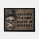 Cráneo espeluznante de Halloween con una alfombra negra de sombrero de bienvenida. La tipografía dice "Bienvenidos a nuestra casa de horrores".