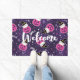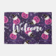 Un felpudo de bienvenida con un adorable patrón temático de Halloween. Gatos con gorras brujas, sentados sobre calabazas rosas con telarañas moradas en el fondo.