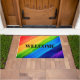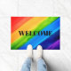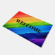 Doormat de bienvenida al arco iris. Este pintoresco porro está decorado con franjas acuáticas de colores arcoiris y con la palabra Bienvenidos. Puedes cambiar la palabra si lo deseas. Acuarela original © Michele Davies.