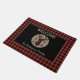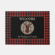En el centro de un círculo de color tostado en esta bonita alfombra de puerta hay una silueta de búfalo trenzada con ojiva. Las flechas negras opuestas están a cada lado de la cabeza. El círculo se coloca sobre un fondo negro, que se enmarca con un borde cuadrado rojo y negro de búfalo. El texto de su personalizado está en coincidencia con la imagen de arriba y abajo del círculo y del ciervo. Perfecto para una cabaña, o casa de campo, pero cómodo en la ciudad también!