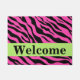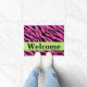Bienvenidos a su casa con esta exuberante salpicadura de color de fushia rosa brillante y estera de puerta de piel de cebra negra. Esta alfombra de puerta se personaliza con la palabra Bienvenida que puede cambiar a otra palabra o nombre. Una tira de color verde lima proporciona un espacio para la personalización y el color adicional. Disfrute de este popular y contemporáneo diseño que le dará un toque de decoración casera moderno y colorido. Este diseño está disponible en varias combinaciones de colores en esta tienda o puede ser personalizado para usted.