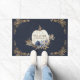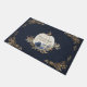 "Bienvenida Familia Calabaza Calabaza Foliage Blue Floral Front Door Mat." Bienvenidos a su familia y amigos con este encantador y elegante follaje de otoño en la marina y con un polvoriento diseño floral azul. Una calabaza blanca contrastante se desplaza por el rico fondo de tejido marino oscuro. La obra fue pintada con acuarela por la artista y diseñadora con licencia internacional Audrey Jeanne Roberts, copyright.