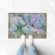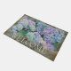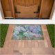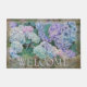 Este elegante doormat floral presenta flores azules y lavanda hidrangea con el mundo "Bienvenidos" que se puede dejar como está o personalizado. Diseñado por el mundialmente reconocido artista Tim Coffey.