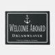 Hermosa y elegante alfombra de bienvenida para su yate o barco. Monogramado con el nombre de su nave. Náutica con borde de cuerda, ancla y tipografía. Bienvenido Aboard con su nombre y ubicación. Perfecto para casas de lago, casas de playa y barcos en los muelles. Colores verdes y blancos.