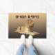 Representación tostada y marrón de un león de piedra tallado en un fondo de los mismos colores junto con la lectura de texto hebreo "B'ruchim Haba'im" (ב ר ו כ ה י ^ bienvenido).
