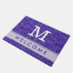 Una elegante alfombra de bienvenida purpurina morado invita a sus huéspedes con estilo. El falso color purpurina púrpura doormat tiene una banda gris plateada con las palabras de bienvenida, que usted puede personalizar, para hacerlo único y especial. Agregue su letra inicial de monograma.