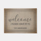 Este divertido diseño de felpudo muestra las palabras "Bienvenido, por favor, váyase por 9". Personalice esta bonita alfombra rústica de puerta burlap con su nombre familiar y el saludo personalizado. El perfecto y moderno hogar cálido o el nuevo regalo de los propietarios.