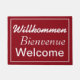 Reciba a sus huéspedes con una puerta multilingüe que incluye las palabras alemana, francesa e inglesa "Welcome". Mostrado aquí en rojo oscuro, puede editar el color de fondo al color de su elección seleccionando el botón "personalizar".