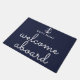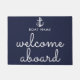 Elegante alfombra de bienvenida personalizada con el nombre de su barco o capitán en un texto clásico blanco sobre fondo azul marino. Diseñado por Thisisnotme©