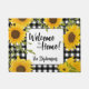 Esta tibia y colorida alfombra de bienvenida florida tiene girasoles amarillos y naranjas con un mensaje de bienvenida a nuestra casa y un nombre de personalizable. El fondo negro y blanco de las mantas de búfalo le da un toque de casa de campo. Reciba a los visitantes con una alfombra exterior que le dará un toque de alegría a su jardín.