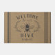 Bienvenido a este bonito felpudo con la temática de las abejas, con un ilustracion de abejas de estilo vintage adornado con hojas botánicas y detalles en el recorte de cuerda. "Bienvenidos a nuestra colmena" aparece en letras de carbón vegetal. Personalice el nombre de su familia en la parte inferior.