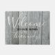 Las esteras de las casas de campo para acoger a los huéspedes con estilo. El fondo rústico de madera gris le da un aspecto de moda campestre. Personaliza con el apellido.