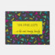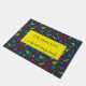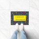 Esta alfombra, de estilo memphis, destaca en su porche. Con un fondo oscuro con triángulos rosados coloridos, azul violeta, puntos y zags de zig, hay una caja amarilla en el medio con un contorno verde. Luminoso y colorido, compra el tuyo hoy!