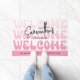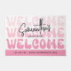 Moderna estera de puertas de bienvenida con fuentes retro y fondo rosa degradado. El diseño groovy del tipo de letra dice 'bienvenido' con el tipo de letra de guión moderno en la parte superior donde puede escribir su nombre o nombre de negocio; incluso hay espacio para su número de teléfono y sitio web. Esta alfombrilla de auto de moda le dará un toque de diversión y feminidad a su peluquería, estudio de maquillaje, barra de lavado, spa de uñas o cualquier otro espacio personal o de negocios.