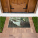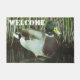 Bienvenidos a su casa con este portero de temática natural. Una foto de un pato mallard sobre una roca en el agua adorna esta alfombra de bienvenida. Este peculiar ave masculina está de pie alto y muestra sus brillantes plumas verdes en la cabeza. "La bienvenida aparece con tipografía blanca en la esquina superior izquierda y puede personalizarse fácilmente si lo desea. Perfecto para una cabaña o la casa de un amante de las aves.