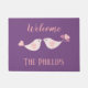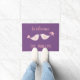 Bienvenido a su casa usando este bonito doormat. Con un fondo morado, "Bienvenida" está escrito en la parte superior con una fuente cursiva rosa. Debajo hay dos pájaros de amor rosados. Debajo hay un lugar para insertar su nombre. ¡Haga su pedido hoy mismo!