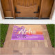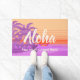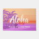 Peach, coral y violeta. El mensaje de Aloha da la bienvenida a sus visitantes a su propio paraíso tropical. Inspirado por los camisetas de los bordadores y aloha de los años 60, este patrón utiliza rayas de alfiler para crear la línea costera mientras los surfistas esperan la pausa en Big Sunset en la costa norte de Oahu. Puede personalizar el mensaje.