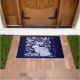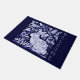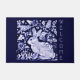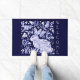 Mi original diseño de cerámica de conejo azul y blanco con derechos de autor es una decoración clásica para una alfombra de bienvenida de bonito. "Bienvenidos" se imprime verticalmente al lado de las obras de arte de un bonito conejo y pájaros en un jardín estilizado lleno de viñas y flores inspiradas en motivos antiguos de Delft, Dedham y cerámica de chinoiserie asiática. Artes y diseño singulares, originales y singulares de Tuzi Williams.