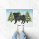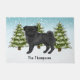 El original ilustracion personalizado de Destei de un adorable perro de raza Pug color abrigo negro. El perro es colocado en una escena invernal con tres abetos verdes y la caída de la nieve. El fondo es un degradado de azul a blanco que da al diseño ese aspecto frío del invierno. También hay un área de texto personalizable para un nombre.