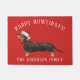 Doormat de Navidades adorables con un Dachshund negro y tan vestido con un sombrero de santa en un fondo rojo festivo.