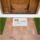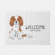El original ilustracion personalizado de Destei de un lindo color blenheim Cavalier Rey Carlos español perro de raza que está sentado. También hay texto que ahora dice "Bienvenida" junto con un área de texto personalizable para un nombre de familia u otro texto personalizado. El fondo tiene un patrón de huellas de pata grises.