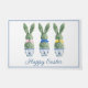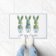 This Easter doormat features cute bunny rabbit green topiaries with pink, blue and yellow bows in blue and white chinoiserie flowerpots. Personalize the holiday message with your choice of special text.