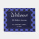 Un doormat elegante y llamativo con un diseño de manta azul búfala. El patrón de comprobación de búfalo forma un entorno atractivo para la sección central, que es azul oscuro con texto blanco. La redacción comienza con "Bienvenida" en la parte superior de la tipografía de guiones. Debajo, la alfombra puede ser personalizada con su dirección, nombre y fecha 'establecida' en esta residencia. Un regalo de bienvenida ideal y una cálida bienvenida a sus huéspedes.