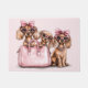 Ilustracion lindo de perros de moda con joyas y gafas sentados al lado de un bolso rosa. ¡Perfecto para los amantes de la moda y de las mascotas!