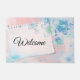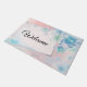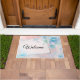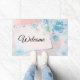 Felpudo Bonito Flores azules en fondo rosado bienvenida