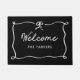 Este elegante y elegante portero negro presenta un original marco blanco dibujado a mano con un moderno arco francés, y un guión de época de moda que dice "bienvenido".
